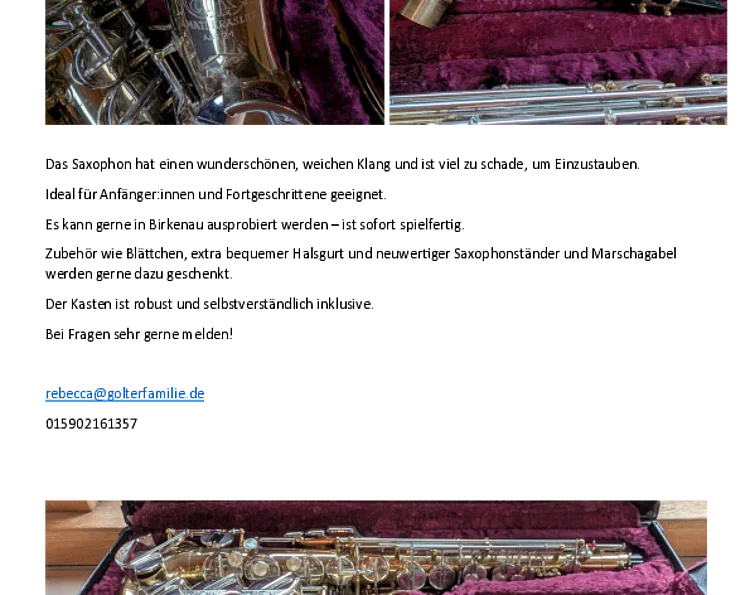 Zubehör wie Blättchen, extra bequemer Halsgurt und neuwertiger Saxophonständer und Marschagabel werden gerne dazu geschenkt.