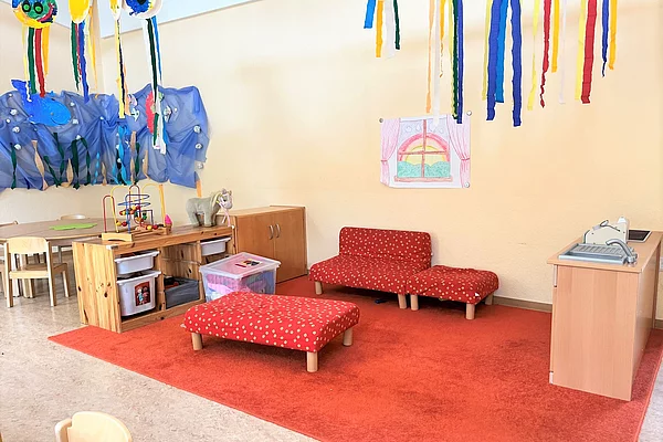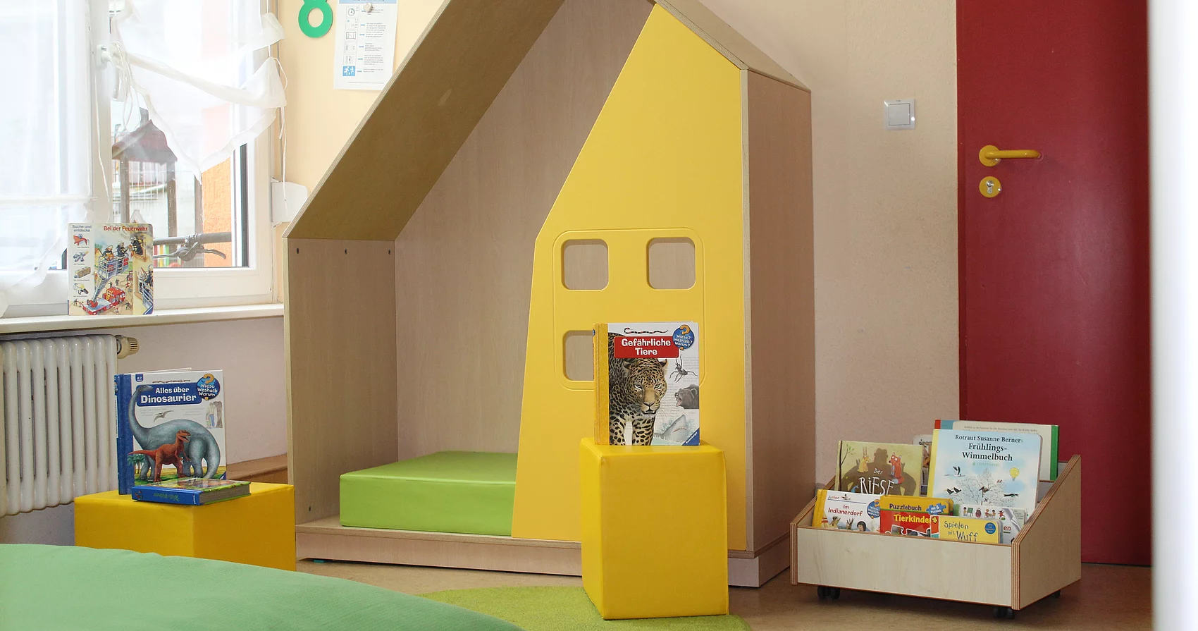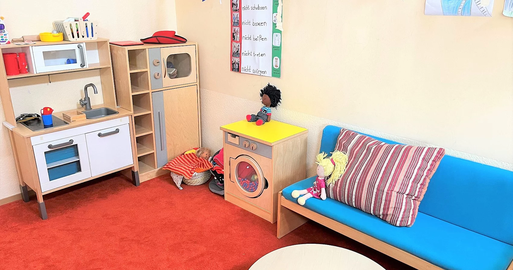 2 Gruppenräume mit Bau-, Puppen und Lese-Ecken, sowie Kreativbereich, Foyer, Mehrzweckraum, Waschraum, Küche, großzügiges Außengelände
