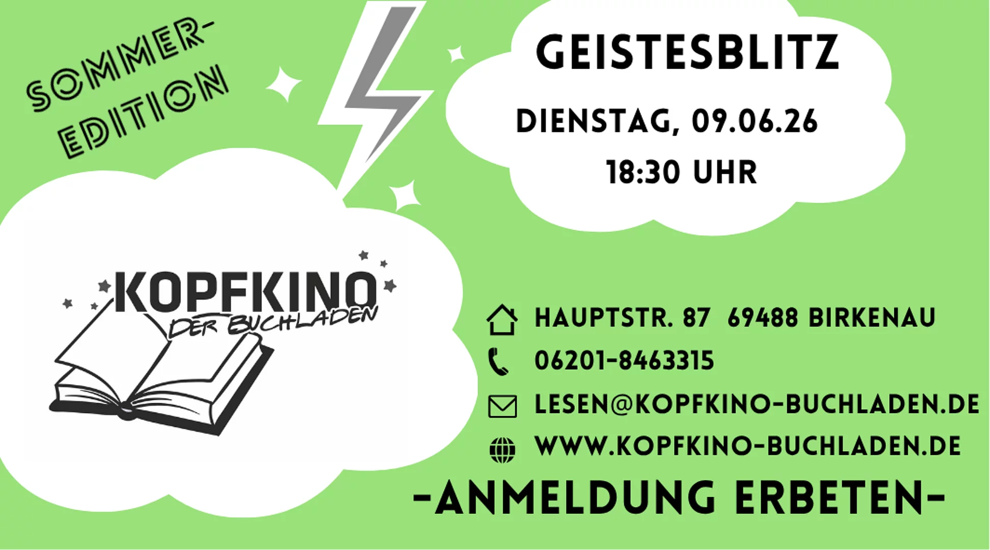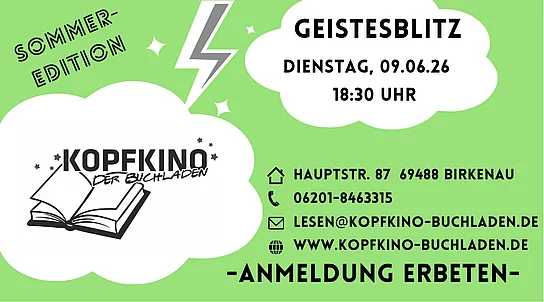 Am Dienstag, den 09.06.26 um 18.30 Uhr laden wir Sie herzlich ein zu einem weiteren „Geistesblitz“ im KOPFKINO. Als perfekte Einstimmung auf den Sommer präsentieren wir Ihnen in ca. 45 bis 60 Minuten unsere aktuellen literarischen Highlights. Ein kühles Getränk in der einen Hand und die Aussicht auf den nächsten Page-Turner in der anderen – da kann der Urlaub eigentlich nur gut werden!