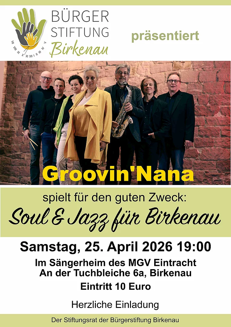 Am Samstag, den 25. April 2026, lädt die Bürgerstiftung Birkenau um 19:00 Uhr zu einem besonderen Konzertabend ins Sängerheim des MGV an der Tuchbleiche 6 ein. Unter dem Motto „Soul und Jazz für Birkenau“ spielt die siebenköpfige Band Groovin’ Nana ein abwechslungsreiches Programm aus groovenden Eigenkompositionen und kreativen Neuinterpretationen legendärer Hits. Die Formation präsentiert ein Programm mit stilistischer Bandbreite, das durch harmonische Raffinesse und rhythmische Vielfältigkeit überzeugt: Das Spektrum reicht von Neuinterpretationen zeitloser Standards wie ‚Sunny‘ und ‚Summertime‘ über eine virtuos arrangierte Funk-Version von ‚Stayin’ Alive‘ bis hin zu einer aktuellen japanischen Chart-Kompositionen.